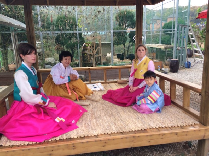 Feeling like royalty in our Hanbok, we play some Tuho. We both do quite well- and I land at least one every round in the center! Next up is Yutnori, which I’ve always wanted to play. It’s the most popular traditional game of Korea, and features the players throwing a set of marked sticks in order to make certain combinations. Holly and I play with Halmoni and the little grandson (who was shy at first, but soon huddled close to me in shared competitive game spirit!). I’m not sure, but I’ll go ahead and say I think I did pretty well in this game too.