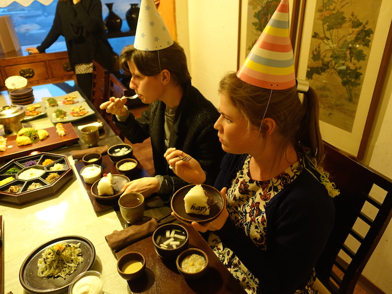 We entered the wooden restaurant and were greeted by the owners, and directed to walk up the staircase. I was told to walk up first, then walk along to the side and into a room just off the main area. Happily I went on ahead, and so it was I unsuspecting I walked into a loud chorus of Happy Birthday (or saeng-il chukha hamnida) from the entire shooting crew.