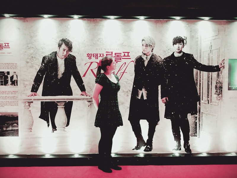 I happily purchased a program and recording, and a recording of Wildhorn’s Count of Monte Cristo too! Then I dragged Holly and Adela around to take photos of me with all the posters. As you can see, Ahn Jae Wook got a little attached.