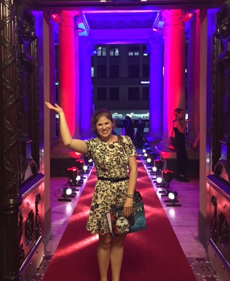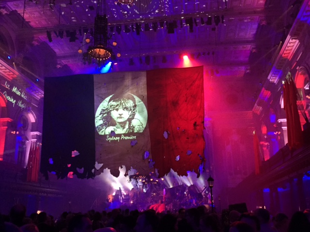 After the musical we were all invited along to the after party, located at Sydney’s Town Hall. George St was lined with our flag bearing ushers once more. Town Hall itself looked a sight, with projections lighting up the old building in the trademark red, white and blue of the French musical. More red carpets and more flags led us into the internally lit hallways and along into the main atrium. Through the crowds lay a giant barricade (like that we just saw in the musical) acting as a DJ booth! From the ceiling hung a giant burnt out flag bearing the emblematic face of Cosette. It was pretty breathtaking…